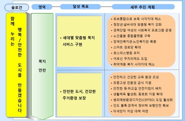 우선 세대별 맞춤형 복지 서비스 구현은 △유보통합으로 보육 사각지대 해소 △청장년·설버세대 맞춤형 복지 강화 △경력단절 여성의 사회복귀 프로그램 운영 △노인돌봄 종합플랫폼 구축 △장애인복지관·노인복지관 확충 △스마트 경로당 확대 △호스피스병원 유치 △어르신 주치의제도 도입 △취약계층 복지 사각지대 해소 등으로 다양하다.