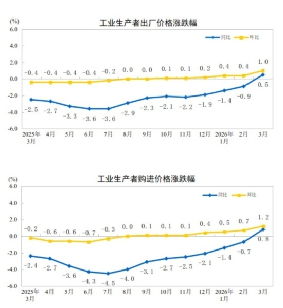 중국 국가통계국(國家统计局)에 따르면 2026년3월분 전국 산업생산자출하가격은 전월 0.9%에서 0.5%로 상승 전환했다. 전월 대비 1.0% 상승했으며 상승폭은 전월 대비 0.6%포인트 확대됐다.
